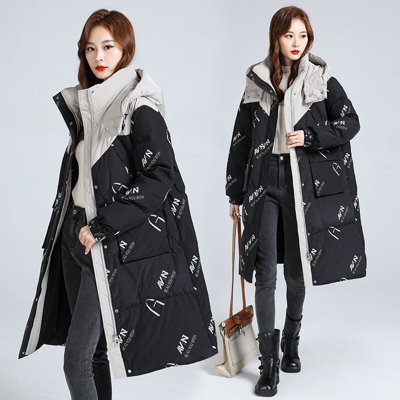 2025 Mellomlang til lang dun for kvinner i, nye tykke varme vinterklær, trykt og skjøtet bomullsjakke