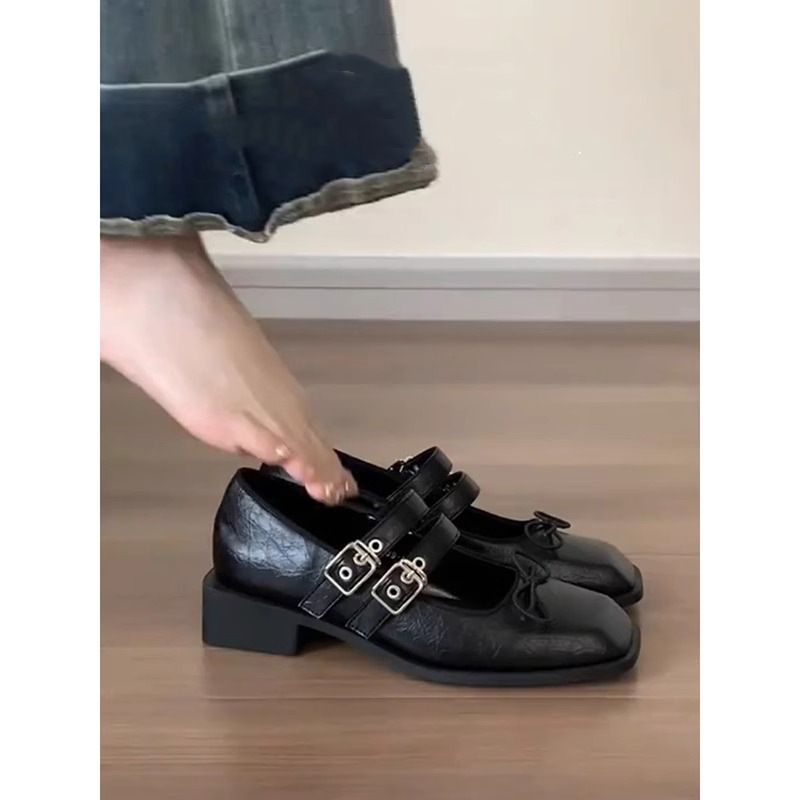 Lancui~ Black Mary Jane For Women Spring Shallow Mouth Leather Double Buckle Strap Thick Heel Single Shoes