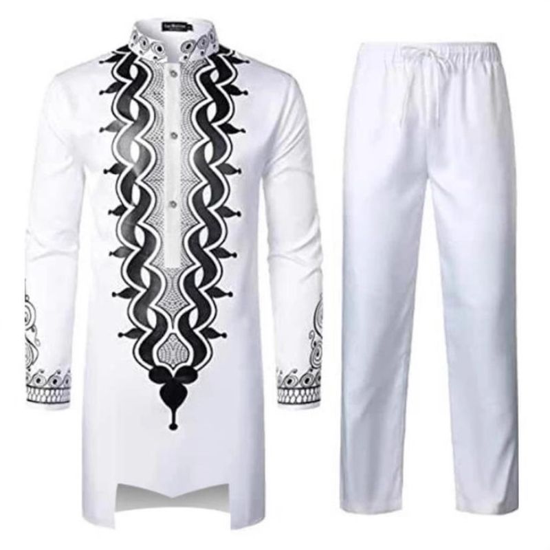 Muslim Style Men's Long Sleeve Long Pants Set Stand Collar Ethnic Style Printed Two-Piece Set