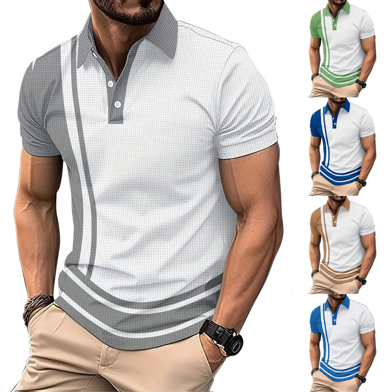 Sommer Ny Herre Poloskjorte Kortermet 3D-trykt Stripete Knapp Vaffelmønster T-skjorte for Herrer